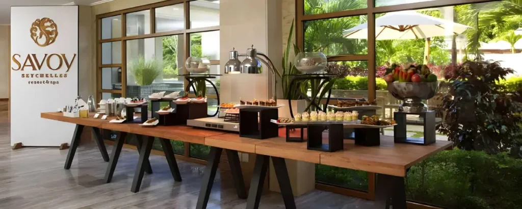 Grand Savoy is the main dining venue at Savoy Seychelles Resort & Spa, located in Beau Vallon on Mahé Island. The restaurant offers contemporary international cuisine with a Creole touch, providing guests with a diverse culinary experience in an elegant setting.