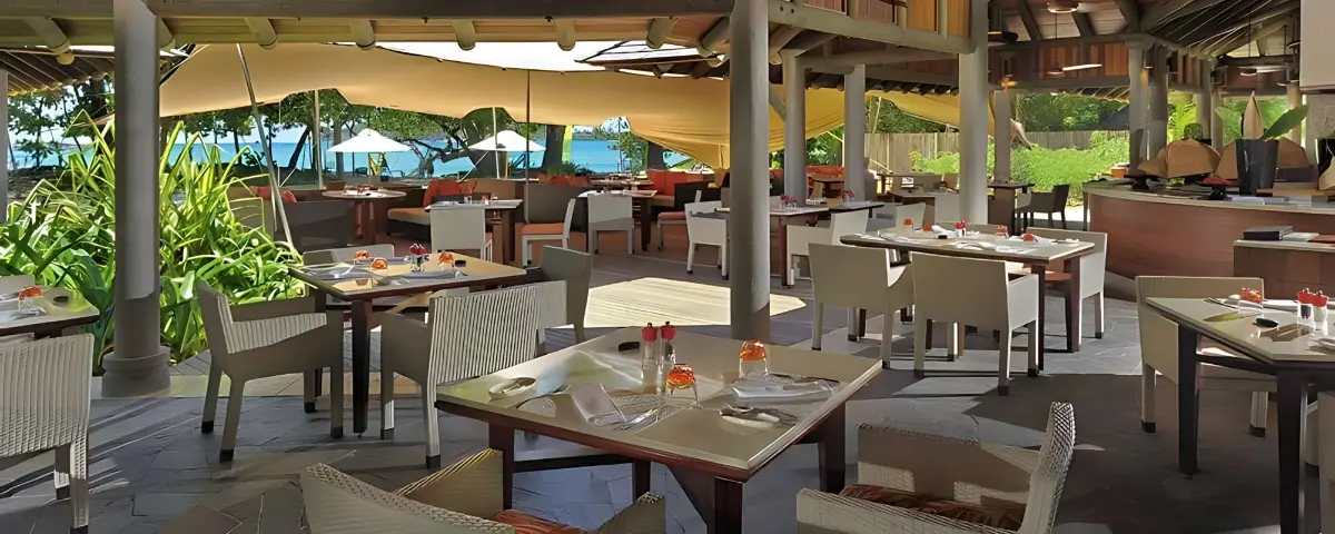 Seselwa Restaurant is a vibrant dining venue located within the Constance Ephelia Resort on Mahé Island, Seychelles. Situated against the stunning backdrop of North Beach, it embodies the fresh, festive spirit of the Seychelles with its crisp white furniture and colorful cushions.