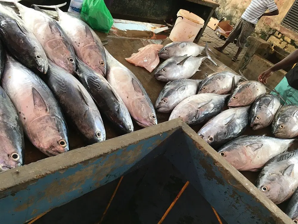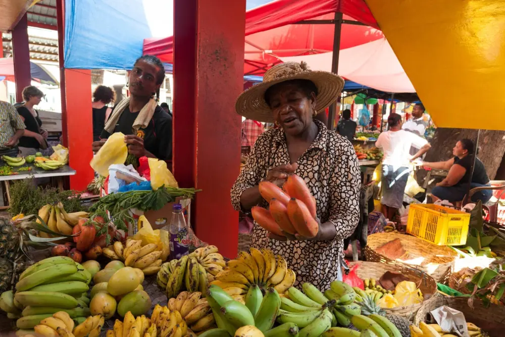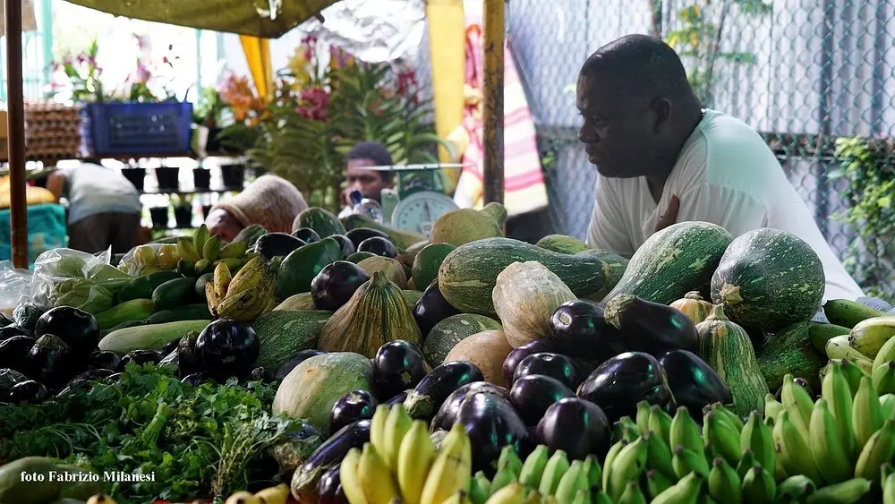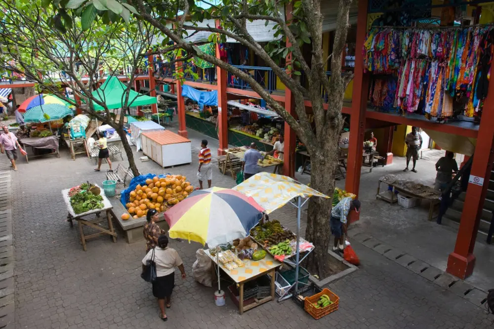 • A wide array of fresh fruits, vegetables, spices, and the daily catch of fish, showcasing Seychelles’ agricultural and fishing heritage.