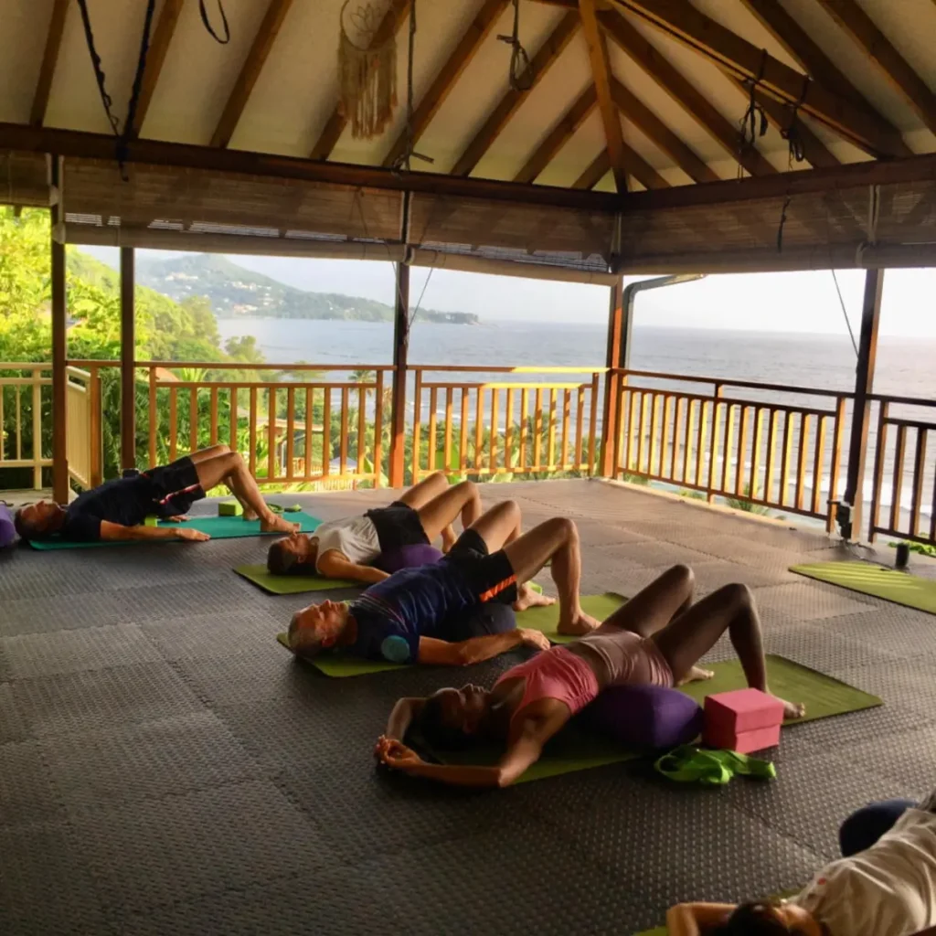 Tranquil Setting: Nestled on the mountainside overlooking Anse Parnel Beach, the location provides a peaceful backdrop for yoga and wellness activities.